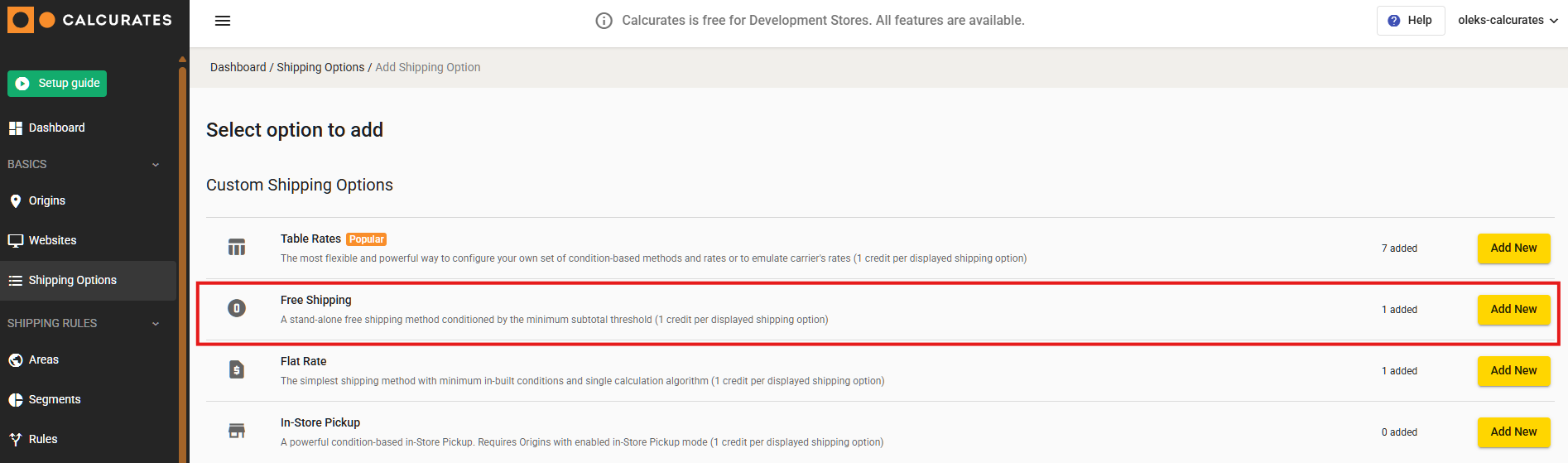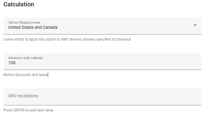 The Free Shipping option in Calcurates allows you to offer free shipping using customizable conditions, such as specific shipping areas, minimum order subtotal thresholds, and SKU exceptions. With the addition of Shipping Rules, you can further refine and tailor your Free Shipping options to fit your business needs. Add Free Shipping Option