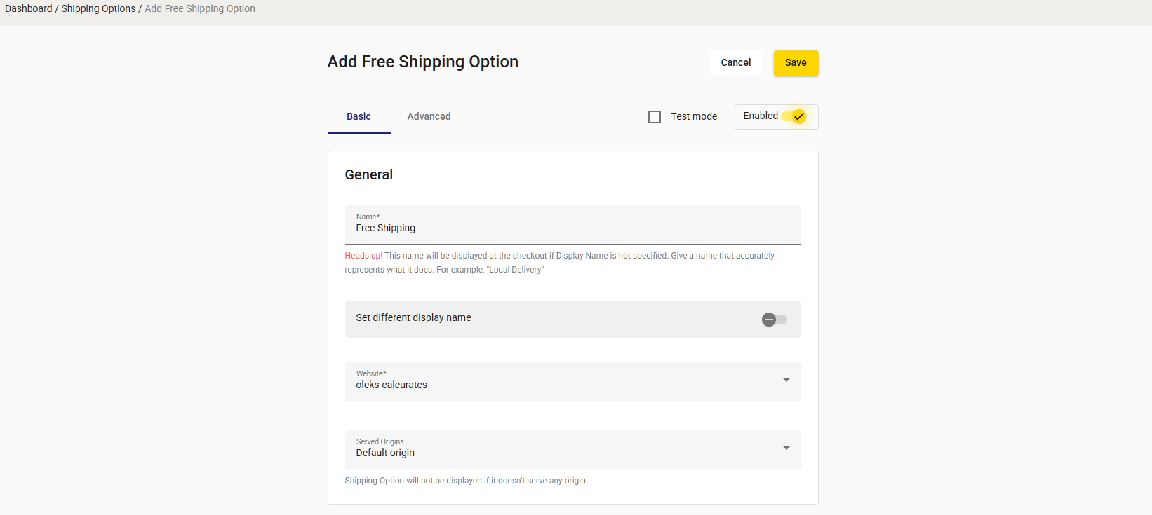 - Website. Pick the store's Website on which you want to display this Free Shipping option.