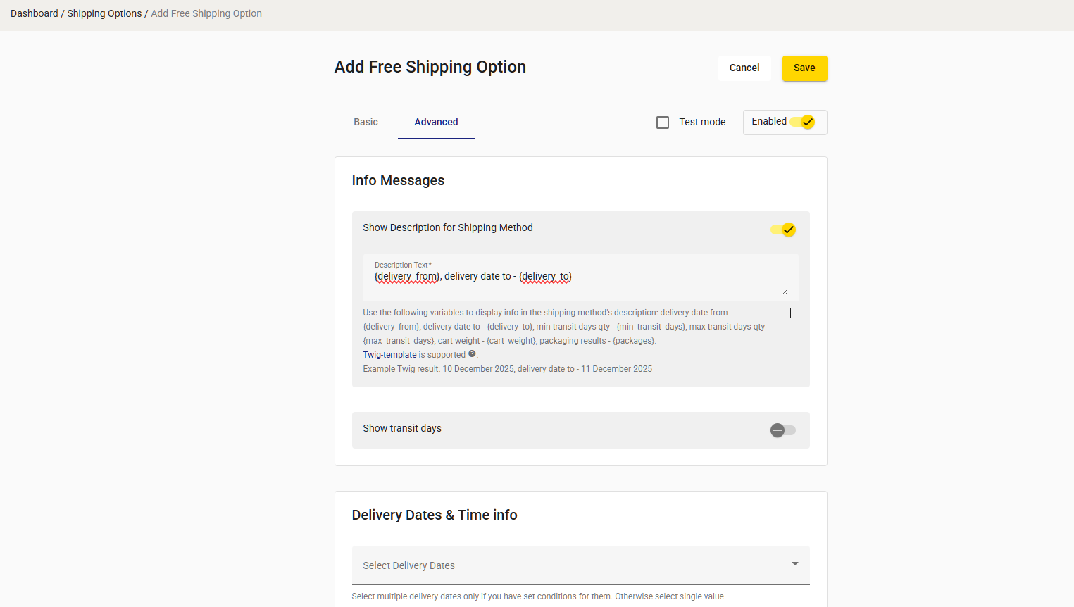 - Select Delivery Dates. Add Estimated Delivery Dates for your Method. Choose from available Delivery Dates profiles.